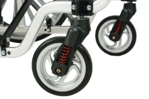 - Experience a stable, bump-free journey with patented front + dual rear shock absorbers that absorb impact from uneven floors, thresholds, and outdoor surfaces. The shock system reduces vibration and discomfort, ensuring a smooth, comfortable ride whether you’re moving around the home or navigating outdoor paths.