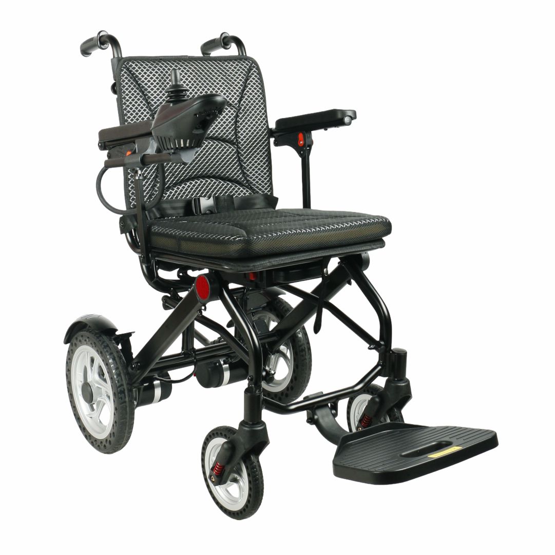 - Crafted with a lightweight aluminum frame, this electric wheelchair weighs just 20kg, making it easy to lift and carry. The one-touch fold design lets you collapse it in seconds for compact storage or transport. It fits neatly in car trunks, closets, or small living spaces, so you can take it anywhere without hassle.